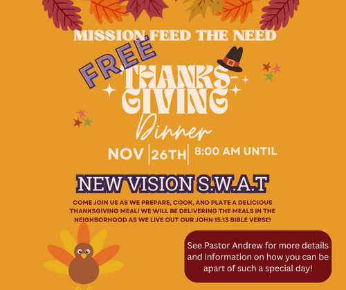 Come and join the SWAT group in providing and delivering meals. This is a great opportunity to be the hands and feet of JESUS. We are blessed and have so much to be thankful for, it is the season to give back and share with others!